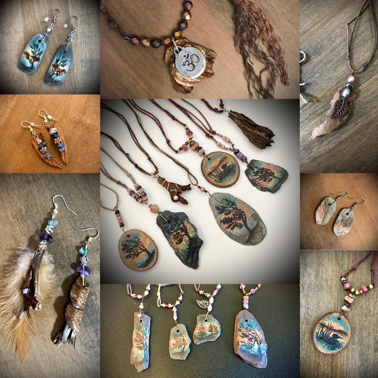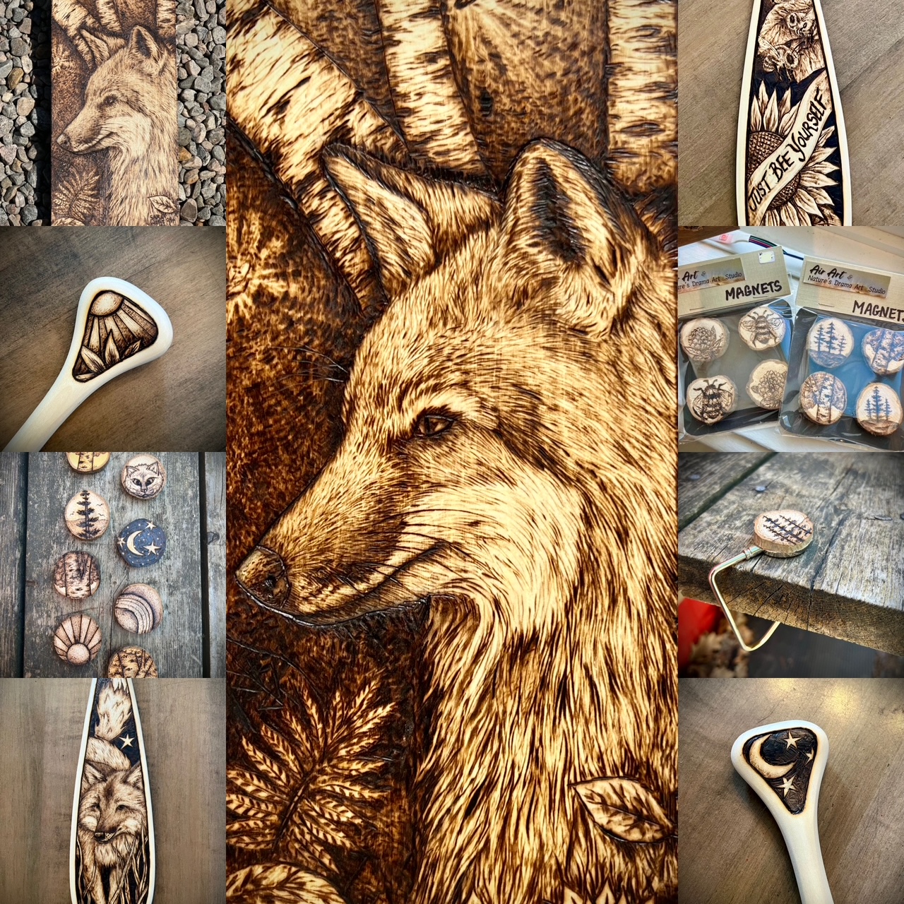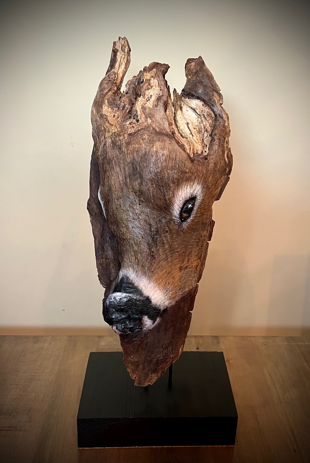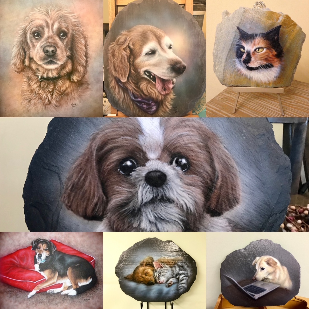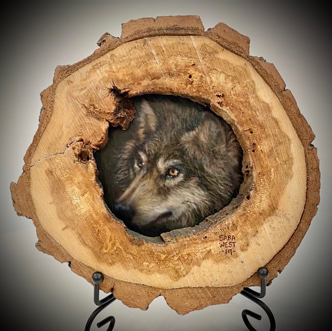 Wildlife/nature painting and sculpture being her main interest, she also does murals for homes and businesses, people & pet portraits, nature jewelry, wood burning, wood cut out displays/signs, faux wood beams/rock/etc., airbrushing on vehicles/helmets/leather and much more.