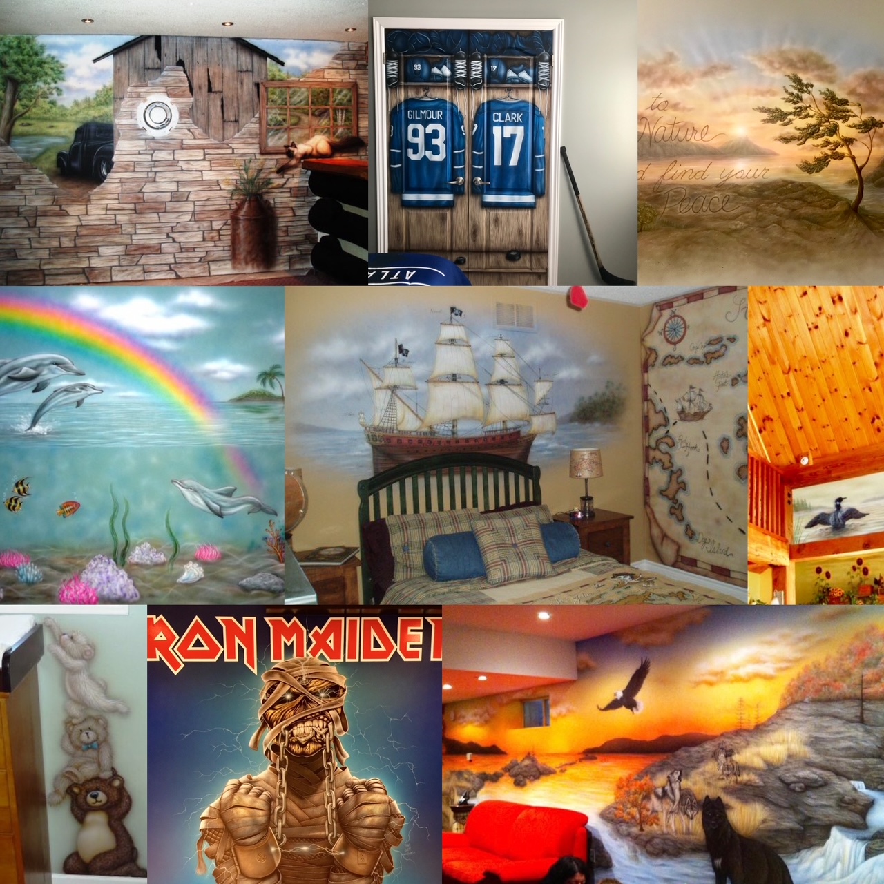 Sara has a studio in Milford Bay, open to the public by chance (if the purple banner is up) and by appointment. Murals and faux beams/rock can be seen in her home there as well.